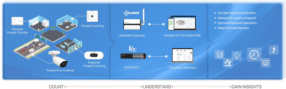 The solution acquires reliable counting of people in both directions simultaneously and counting of people in the specific region with the help of the latest AI. By getting accurate and real-time people flow statistics, it greatly contributes to better space utilization, improved energy saving, and more value-added business running.